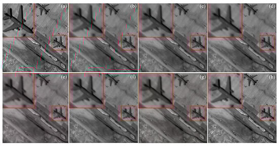 HR and SR results of the test image airport with a rotation angle of 135° and an aspect ratio of 6. (a) HR; (b) SRGAN; (c) EDSR; (d) SRMD; (e) real-ESRGAN; (f) DualSR; (g) FSSR; and (h) proposed method.