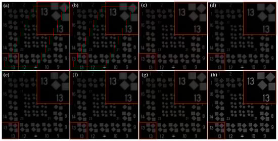 LR and SR results of the semi-physical experimental image with a rotation angle of 0° and an aspect ratio of 3. (a) LR; (b) SRGAN; (c) EDSR; (d) SRMD; (e) real-ESRGAN; (f) DualSR; (g) FSSR; and (h) proposed method.