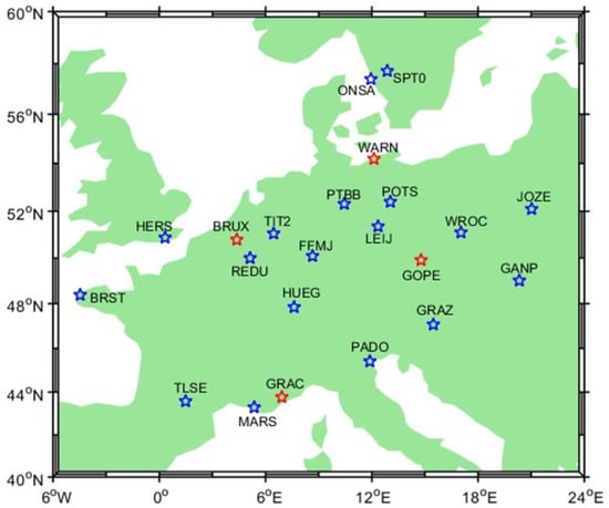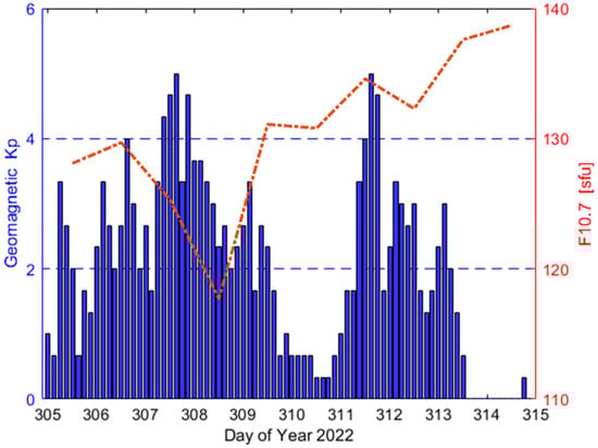 Twenty-two MGEX stations located in Europe were selected to build a regional reference network. The distribution of these multi-GNSS monitoring stations is shown in Figure 1. It should be noted that 18 blue stations are used for modeling the regional RT between-satellite SD ionospheric delays, and 4 red stations are used to carry out the multi-GNSS RT SF-PPP based on the between-satellite SD ionospheric constraints. The experimental period was set between DoY (Day of Year) 305 to 314 in 2022. The ionospheric conditions over these days can be presented in Figure 2. Except for DoY 310 and 314, the ionosphere is relatively active on all other dates, with over half of the geomagnetic Kp values exceeding 2. Especially on the DoY 307 and 311, some Kp values may even up to 4–5 and indicating intense ionospheric activity. Corresponding, the relatively high solar activity can be observed during the testing period since the most F10.7 index more than 20.