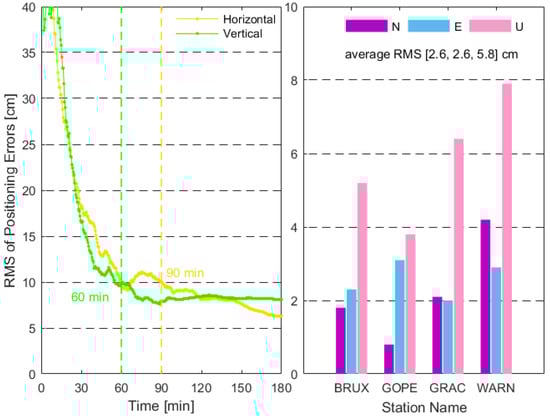 RMS of positioning errors during the first 3 h and positioning accuracy of each station after 3 h convergence in multi-GNSS static RT SF UU-PPP (DoY 305-314, 2022).