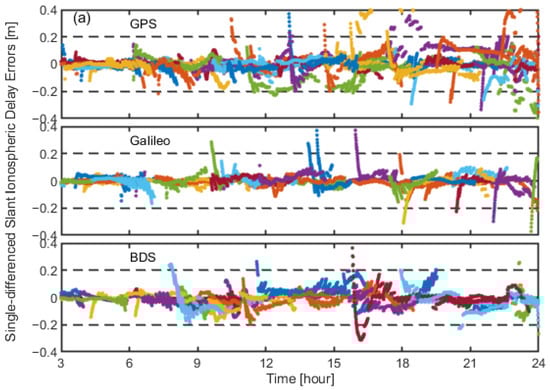 Considering the great long-term stability of satellite DCB within several days, its estimation accuracy can be better than 0.1 ns []. The multi-GNSS experiment (MGEX) final DCB products are generally used to correct the satellite DCB in Equation (11). The receiver DCB can be removed using the between-satellite SD algorithm. Thus, we can obtain the SD ionospheric delay as follows: