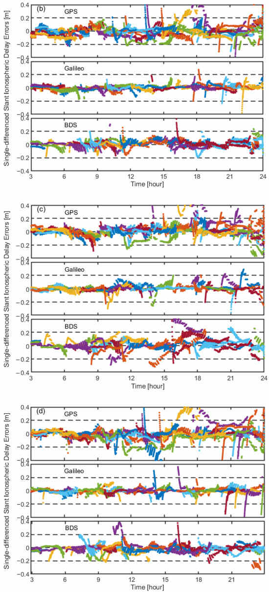 The internal accord accuracy of the SD slant ionospheric delays derived from the regional RT between-satellite SD ionospheric model can be better than 0.5 TECU, and its average RMS of GPS, BDS-3, and Galileo satellites are 7.0, 7.2, and 5.1 cm, respectively. Using the dSTEC variation calculated from between-satellite SD and epoch-differenced GF phase observations as a refence, the external accord accuracy of this ionospheric model proposed in this study is significantly better than that of the GPS Klobuchar, BDGIM, and CNES SSR VTEC models, and its average RMS of less than 1.0 TECU can be achieved.