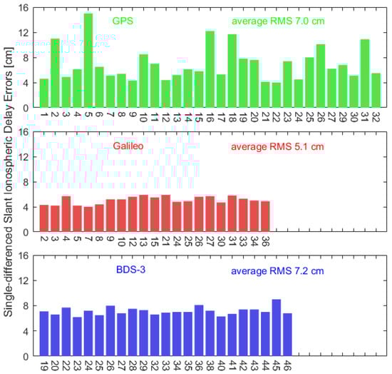 The RMS of between-satellite SD slant ionospheric errors calculated from results of 4 selected stations on 10 days are shown in Figure 5. There is a significant difference in the internal accord accuracy of different GPS satellites. The RMS of between-satellite SD slant ionospheric errors for most GPS satellites is lower than 8 cm, while for G05 satellite, its RMS can be up to 15 cm. In contrast, the difference of internal accord accuracy for Galileo and BDS-3 satellites is not much, its RMS is maintained at around 5 cm for Galileo satellites and can be lower than 8 cm for BDS-3 satellites. The average RMS of between-satellite SD slant ionospheric errors for all GPS, Galileo, and BDS-3 satellites are 7.0, 5.1, 7.2 cm, respectively. This proves that the internal accord accuracy of the regional RT between-satellite SD ionospheric model using multi-GNSS SF observations can be better than 0.5 TECU (1 TECU ≈ 15.6 cm).