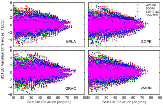 Although the internal accord accuracy of the regional RT between-satellite SD ionospheric model has excellent performance, its true accuracy still needs to be validated by external accord accuracy. Considering that the differential STEC (dSTEC) derived from epoch-differenced geometry-free (GF) combinations of phase observations have mm-level accuracy, the variation of dSTEC can be further obtained from the between-satellite SD algorithm []. This between-satellite SD dSTEC can ebe regarded as reference value. For the regional RT between-satellite SD ionospheric model, the between-satellite SD slant ionospheric delay can be directly calculated, and then the model value of dSTEC variation was obtained using the epoch-differenced method []. Similarly, the above model value of dSTEC variation can be calculated from the GPS Klobuchar, BDGIM, and CNES SSR VTEC ionospheric models. Therefore, the difference between the model and reference values can be defined as an indicator of external accord accuracy. Figure 6 shows the differences in dSTEC variation of 4 red stations using GPS, Galileo, and BDS-3 satellites. It is worthing that the calculate interval of external accord accuracy was set to 5 min and the results of elevation exceeding 10 degrees are removed in this assessment. The abbreviation for “GPS-Klo” and “SD-VTEC” are represented as the GPS Klobuchar model and the regional RT between-satellite SD ionospheric model, respectively. We can see that the dSTEC variation differences of different stations have similar distribution, and their values decrease with the increase of elevation. The dSTEC variation differences of the GPS Klobuchar model have the maximum range and even exceed ±5 TECU. There is not much difference in external accord accuracy among the GPS Klobuchar, BDGIM and SSR VTEC models. Compared with the above three models, the variation range of the regional RT between-satellite SD ionospheric model in external accord accuracy is mainly concentrated in ±2 TECU and can be lower than 1 TECU at high elevation. This indicates that the regional RT between-satellite SD ionospheric model has higher accuracy as expected.