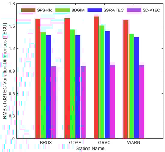 The RMS of dSTEC variation differences for all selected ionospheric models using 4 red stations throughout the entire testing period is given in Figure 7. Except for the regional RT between-satellite SD ionospheric model with RMS value of below 1.0 TECU, the RMS of dSTEC variation differences for all other ionospheric models is more than 1.3 TECU and even up to 1.6 TECU. The average RMS values of all stations in external accord accuracy are 1.60, 1.44, 1.39, and 0.96 TECU for the GPS Klobuchar, BDGIM, SSR VTEC, and regional RT between-satellite SD ionospheric models, respectively. This result demonstrates the feasiblilty of modeling the high-precision ionospheric delay using multi-GNSS SF observations.