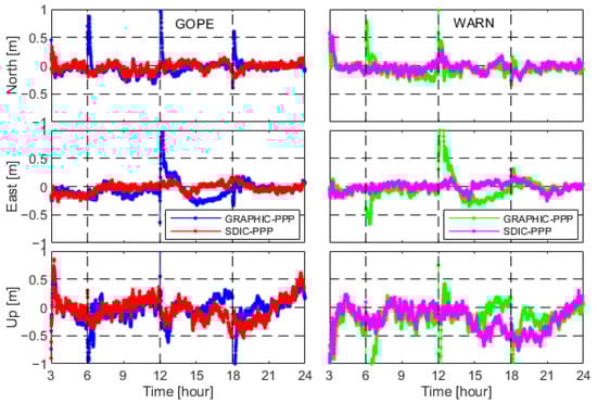 As long as the accuracy of external ionospheric constraints is high enough, the positioning accuracy and (re-)convergence of the UU-PPP can be improved in theory []. In order to explore the advantages of the SD ionospheric constrained multi-GNSS RT SF-PPP, the results of high-precision GRAPHIC RT SF-PPP can be used as a reference. Due to the significant influence of code observation noise on the GRAPHIC model, an RT phase smoothing code observation method named CNMC (Code Noise and Multipath Correction) filter was adopted to further improve the performance of the GRAPHIC RT SF-PPP in this study []. Figure 8 shows the daily solutions of the GPS + Galileo + BDS-3 RT SF-PPP in kinematic mode for 2 red stations on DoY 305, 2022. It should be noted that all available satellites are reinitialized with the interval of 6 h to simulate GNSS signal interruption or missing. It is very clear to see that the positioning errors of the GRAPHIC SF-PPP at reinitialized epoch is significantly larger than that of the SD ionospheric-constrained (SDIC) SF-PPP and even exceed 1 m. No matter what SF-PPP models, the positioning accuracy of horizontal component is better than that of vertical component. After convergence, the horizontal and vertical positioning errors can be stable within around 0.2 and 0.5 m, respectively. This indicates that both GRAPHIC and SDIC RT SF-PPP models have the ability to achieve dm-level positioning accuracy in kinematic mode at present.