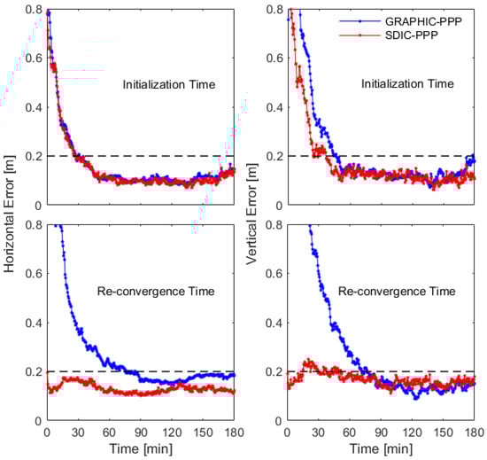 The convergecne curve of the GPS + Galileo + BDS-3 RT SF-PPP in kinematic mode at 68% confidence level is displayed in Figure 9. The absolute positioning errors of 4 red stations during the whole testing period are sorted from small to large at each epoch, and the 68th% of absolute positioning errors for each epoch is selected as representative to measure the convergence performance []. We can see that the horizontal positioning errors of the GRAPHIC and SDIC RT SF-PPP remain consistent in the initialization period, but the vertical positioning errors of the SDIC RT SF-PPP are always smaller than those of the GRAPHIC model during the first 50 min. In the case of setting 0.2 m as the convergence criterion of positioning errors, the convergence time of the SDIC RT SF-PPP with 37 min is less than that of the GRAPHIC RT SF-PPP with 47 min, and its improvement of convergecne speed can up to 21.3%. In the period of re-convergence, due to the introduction of the regional RT bettween-satellite SD ionospheric model, both horizontal and vertcial positioning errors of the SDIC RT SF-PPP can be maintained within 0.2 m. Such excellent positioning performance is significantly superior to the GRAPHIC model, which takes at least 75 min to converge to 0.2 m. This indicates that the positioning errors of the SDIC RT SF-PPP model hardly generate fluctuations when some GNSS signals missing or blocked in the complex kinematic environments.