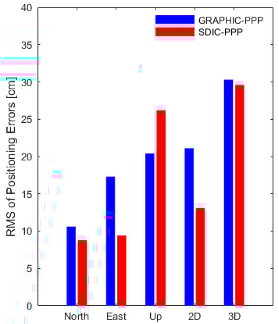 Figure 10 shows the RMS of positioning errors of GPS + Galileo + BDS-3 kinematic RT SF-PPP after convergence of 3 h, and these values are calculated from results of 4 red stations on 10 days. It can be seen that both N and E positioning accuracies of the SDIC RT SF-PPP is better than that of the GRAPHIC model, and its corresponding improvements are 17.0% and 45.7% respectively. However, compared with the GRAPHIC model, the vertical positioning accuracy of the SDIC RT SF-PPP is decreased from 0.21 to 0.26 m, which is caused by the limited accuracy of the regional RT between-satellite SD ionospheric model. If the multi-GNSS DF observations rather than SF observations are used to establish this regional SD ionospheri model, the vertical positioning accuracy of the SDIC RT SF-PPP can be improved like results of []. Therefore, this novel multi-GNSS RT SF-PPP model proposed in this study is mainly benefit to improving the horizontal positioning accurcy, with an improvement rate of 37.9%. From the perspective of 3D comprehensive error, the SDIC RT SF-PPP has slighly better accuracy and can reach within 0.3 m.