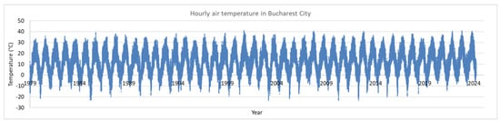 The variation in hourly air temperature data from OpenWeather in °C, between 1 January 1979 and 31 December 2023, in the center of Bucharest City (Piata Unirii, location co-ordinates, 44.43N, 26.10E), is shown in Figure 2.