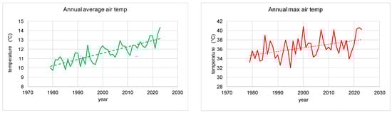 To assess the trend of air temperature over the 45-year period, annual average and annual maximum values were computed and displayed (Figure 3). The plots show a continuous increase over the entire period, with a multi-annual hourly average value of 11.66 °C and a multi-annual hourly maximum value of 40.83 °C. Moreover, starting with the year 2000, one may observe an increase in the frequency of extreme values over 40 °C, such as in 2000, 2007, 2012, and, in particular, over the last three years—2021, 2022, and 2023.
