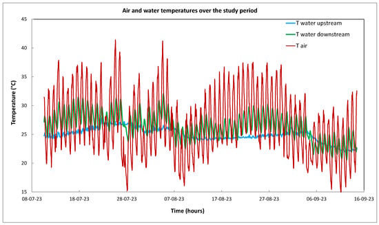 The MX2201-type loggers are enabled with Bluetooth wireless technology. The accuracy indicated by the Onset manufacturing company is of ±0.5 °C, in the temperature range of −20 °C to 70 °C, with a resolution of 0.04 °C and a drift of 0.01 °C per year [36]. Hourly measurements of water temperature were acquired during a study period, between 10 July and 14 September 2023 (about 67 days, corresponding to 1600 h), and are displayed together with the air temperature in Figure 4.
