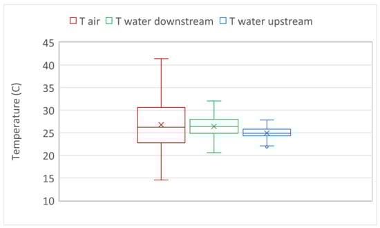 A box plot of air and water temperature variability over this study period is shown in Figure 5. One may see a greater variability of river temperature at the city exit (green whiskers) compared to the water temperature released from the reservoir into the canal, at its upstream end (blue whiskers). Also, a greater difference, of about 10 °C, between the maximum air (upper red whisker) and maximum water temperature at the downstream river boundary (upper green whisker) may be observed in comparison with the corresponding minimum values, of only 6 °C (lower whiskers). Similar observations were reported by Briciu [37].