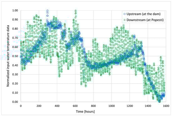 For the training of the ANN, the upstream water temperatures at the dam vary between a minimum of 21.88 °C and a maximum of 27.84 °C, the downstream water temperatures at the exit of Bucharest City are in the range of 20.59–32.04 °C, and the air temperature vary between 14.54 and 41.41 °C. The discharge released from the Morii Reservoir over the entire canicular study period was 3 m3/s. This is the minimum value required by legal regulation for the ecological flow that must be provided, even during prolonged drought periods, particularly during heatwaves.