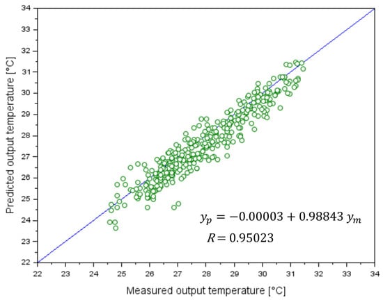 The best fit between the predicted output and the measured output temperatures was found to be a linear regression given by the equations depicted in Figure 10 and Figure 11 for the training and validation stages, respectively. Thus, and represent the measured and the predicted output water temperatures (values at the exit from the Morii Reservoir and at the downstream section of the Dâmbovița River at its exit from Bucharest City). Both are very close to the bisecting line, corresponding to an equal and for the same input data, showing that the two variables are almost identical. Moreover, the overall regressions (Figure 10 and Figure 11) are statistically significant, having a sample Pearson correlation coefficient (R) of higher than 0.95.