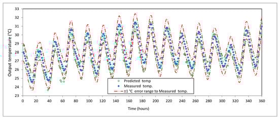To emphasize the good approximation of water temperature at the exit of the Dâmbovița River from Bucharest, given using the ANN model in Figure 12, measured and computed temperatures are depicted for the tested time interval that included a heatwave. It can be observed that differences between the two temperatures fall in the range ± 1 °C, as shown by the dotted envelope red curves.