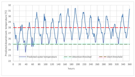 For the same tested time interval, in Figure 13, the attention and alert temperature limits are shown. One can see that the temperature attention threshold, marked in a green color, was exceeded over the entire tested period. The alert temperature threshold, marked in a red color, was also exceeded in 67% of the same period. These results can be attributed to the high air temperatures registered during the 2023 summer period and to the low discharge released from the Morii Reservoir. Therefore, timely measures should be taken to counteract these effects, such as increasing the discharge on the channel. These two thresholds may help water managers to adjust the duration of the increased water discharge released from the Morii Reservoir.