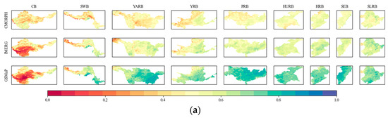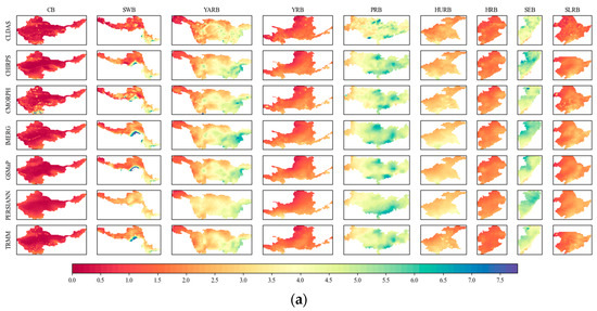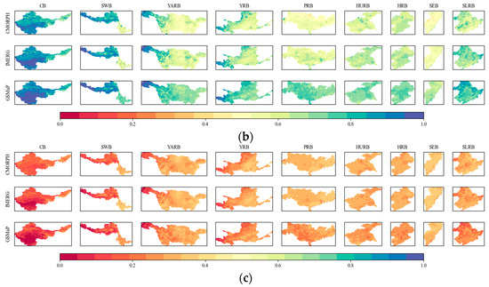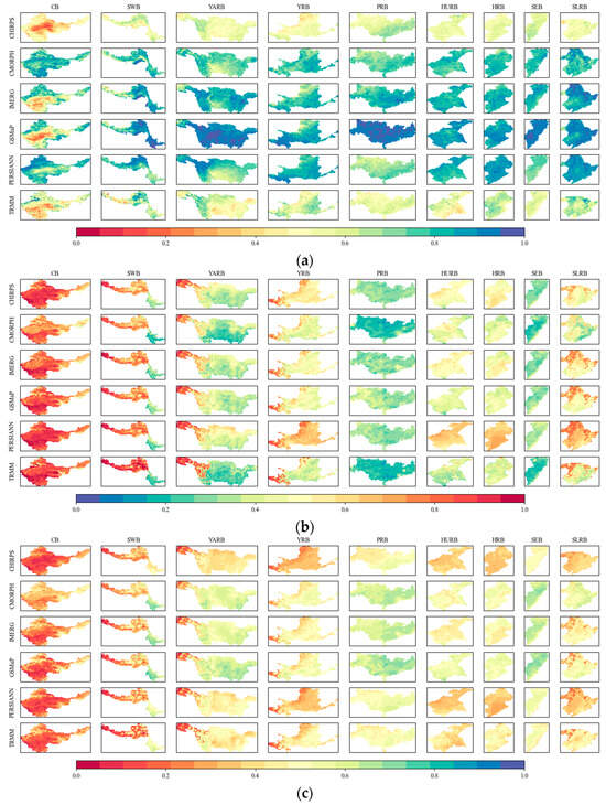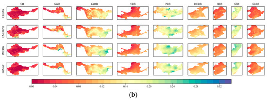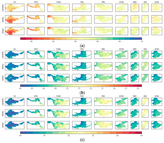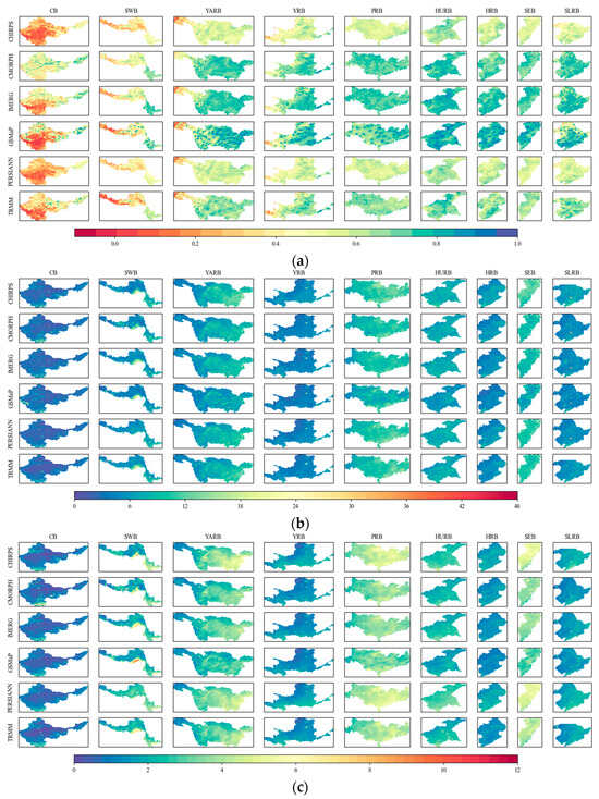 The spatial distribution of the RMSE of six SPPs exhibited strong similarity. Lower RMSE values were observed in regions with drier climates such as CB, YRB, HRB, and SLRB, consistent with findings from Zhou et al. [21]. However, in areas like the YARB and SLRB, localized errors were evident, with maximum RMSE values primarily concentrated in these specific regions (Figure 5b). Regarding the MAE index, localized maximum values were concentrated in the SWB, with GSMaP precipitation data contributing to the largest errors in this region (Figure 5c).