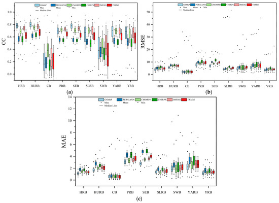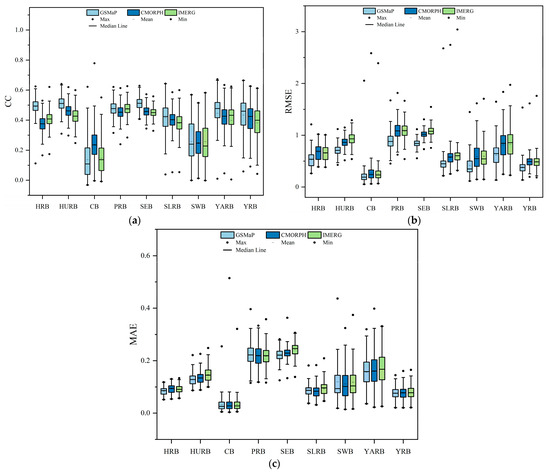 The evaluation results revealed a notable similarity between the MAE index and the RMSE index: the CB consistently exhibited the lowest MAE values, while the PRB and SEB exhibited the highest MAE values. Additionally, the CB displayed the smallest discrepancies between SPPs, whereas the SEB showed the largest variations among them. Given that the SWB and YARB encompass both wet and semi-arid climates, internal precipitation variations were substantial, leading to a significantly elevated degree of MAE dispersion compared to other basins.