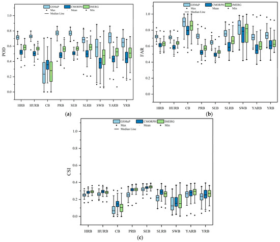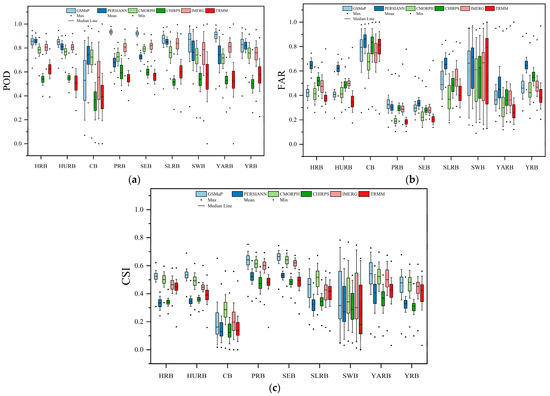 In terms of classification indicators, as depicted in Figure 4a, the performance of the POD index in CB was the worst, with a higher degree of dispersion in POD values observed in both the CB and SWB compared to other basins. This indicates that there are significant differences in SPP observations in drought and semi-drought regions. In CB and HRB, the POD indicators of PERSIANN and CMORPH performed best. A study conducted by Heimi et al. [44] in arid areas of Arabia showed that the overall performance of POD indicators for PERISANN and GPM IMERG was superior, with CMORPH slightly trailing behind. Among the remaining seven basins, excluding CB and SWB, GSMaP exhibited the highest POD, indicating its suitability for wet climate regions. CHIRPS and TRMM exhibited the poorest POD index performance among the nine basins. It is worth noting that the degree of dispersion in the POD index for GSMaP and GPM IMERG in the CB was significantly higher compared to other SPPs, suggesting substantial fluctuations in the observation performance of these two SPPs in drought-prone regions.