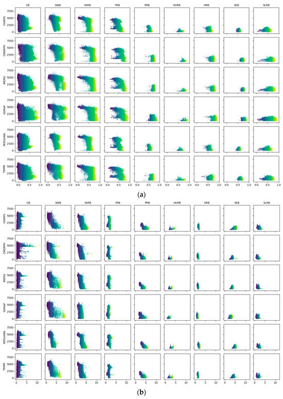 As shown in Figure 3, the CC indicators in the CB and SWB performed worst, with the lowest overall values and the highest degree of dispersion. Situated in western China, the CB and SWB regions predominantly experience arid climates, with precipitation primarily comprising light rain and drizzle [40]. The annual average precipitation in CB stands at a mere 152 mm (1960–2019) [42]. However, satellite observations of light rain and drizzle entail notable uncertainties [19,24,29,43]. Among the remaining seven basins, the median CC indicators of GSMaP, CMORPH, and GPM IMERG exceeded 0.7, while the median CC of TRMM ranged between 0.6 and 0.7, and those of PERISANN and CHIRPS fell below 0.6. CMORPH demonstrated a superior capability in addressing inaccuracies in low precipitation observations, with its CC indicator in the CB and SWB surpassing that of the other five SPPs. GSMaP performed best in the remaining seven basins, but in the SLRB and the YARB, the dispersion of GSMaP’s CC index dispersion notably exceeded that of other SPPs.