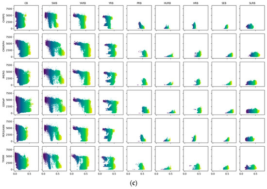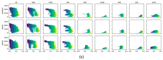 Daily scale indicators and elevation scatter plots of the nine water resource regions: (a) CC; (b) MAE; (c) CSI. In these figures, the color transitions from blue to yellow, representing an increase in the index.