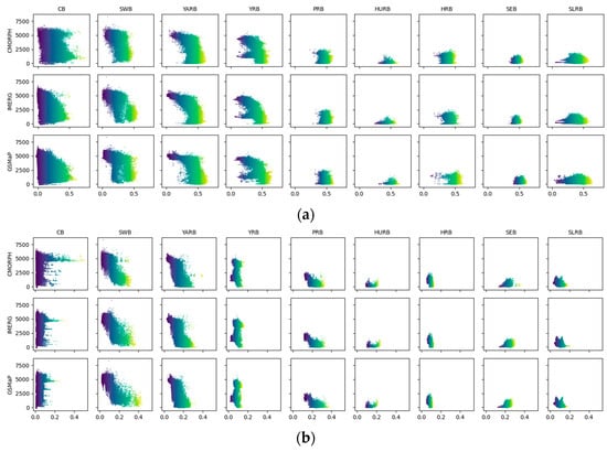 At the hourly scale, there was a noticeable decrease in the accuracy of statistical indicators compared to the daily scale. The main differences included the following: (1) At the hourly scale, the CC index was mostly between 0.2 and 0.6 (Figure 7a), whereas at the daily scale, the CC index ranged from 0.6 to 0.8 (Figure 3a). This indicates that satellite precipitation observations face greater challenges in capturing precipitation events at the hourly scale. (2) At the hourly scale, the RMSE index was generally below 1 mm (Figure 7b), and the MAE index was below 0.3 mm (Figure 7c). However, at the daily scale, the RMSE index ranged from 2 to 10 mm (Figure 3b), and the MAE was mainly distributed between 1 and 5 mm (Figure 3c). (3) Among the nine basins, the RMSE index of GSMaP was lower than those of CMORPH and GPM IMERG, and there was a relatively high consistency in the MAE indices of the three SPPs.