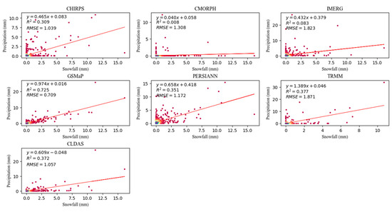 Figure 13 shows the scatter plots of ground snow observation and satellite precipitation observation at the daily scale. It can be intuitively observed from the figure that the detection capabilities of CMORPH and IMERG for daily snowfall were the worst, and there was almost no correlation between rainfall data and snowfall data. In particular, CMORPH had serious false alarms (ground does not observe snowfall, but satellite observes rainfall) and missed alarms (ground observes snowfall, but satellite does not observe rainfall). CHIRPS, TRMM, PERSIANN, and CLDAS have similar detection capabilities for daily snowfall. However, TRMM exhibited larger RMSE errors compared to the other three precipitation products. Among the six SPPs, GSMaP demonstrated excellent snowfall detection capabilities, with better performance than CLDAS, an R2 value of 0.725, and an RMSE error of only 0.709.