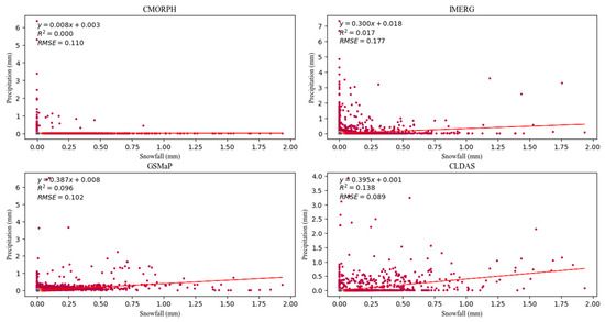 We also compared the performance of three SPPs and CLDAS against ground snowfall observation data at the hourly scale (Figure 14). Unfortunately, none of the precipitation product’s hourly data met the criteria for detecting snowfall. The most obvious observation is that false and missed alarms are severe, with precipitation and snowfall data scattered widely along the horizontal and vertical axes. This indicates the inadequacy of satellite precipitation observation in detecting snowfall at the hourly scale, as well as there being a substantial gap from practical implementation. Indeed, determining the precipitation type (rain or snow) through satellite observation remains an immensely challenging task [53]. Li et al. [52] conducted an analysis of GPM IMERG data in Guizhou Province, situated in the Southwest Basin. Their findings revealed considerable errors, particularly in December, January, and February, with a staggering 80% of precipitation events going undetected during winter. During these three months, the precipitation characteristics in Guizhou Province are particularly complex, mainly consisting of freezing rain and snow mixed with rain [54].