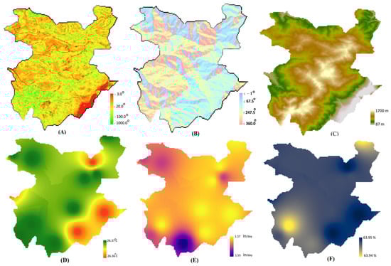 The influencing parameters: (A) slope (°); (B) aspect (°); (C) elevation (m); (D) average daytime land surface temperature (°C); (E) precipitation (mm/pentad); (F) soil moisture at 10 km (%).
