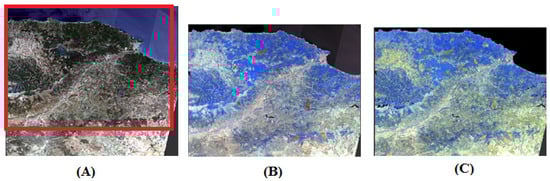 For this area, we selected the Sentinel-2 tiles with latitudes ranging from 36.04° to 37.02° and longitudes ranging from 4.10° to 5.32°, as depicted by the selected Sentinel-2 satellite tile in Figure 3 for both the pre-fire and post-fire images. Data for our study, as shown in Figure 3, were obtained from the Sentinel Scientific Data Hub “https://scihub.copernicus.eu (accessed on 25 November 2021)”. An RGB image of the selected tile is displayed in Figure 1A.