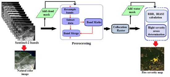 The fire severity mapping process using the SNAP v9.0.0 application is shown in Figure 9. To perform fire severity mapping, we used a similar model to the one provided by the RUS Service in their training section “https://eo4society.esa.int/resources/copernicus-rus-training-materials/ (accessed on 3 November 2021)” but with adjusted parameters specific to our data. We also used the BIAS2 index instead of the proposed RBR index to improve the severity of fire classification.