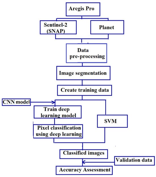 All pre-processing steps for Planet images were performed exclusively within ArcGIS Pro 3.1.0. Initially, the data were imported, followed by georeferencing and projection adjustments to ensure accurate spatial alignment. Subsequently, multiple image tiles were mosaicked together, enhancing visual clarity using 32 unsigned bits, and then our area of interest was extracted by applying a mask, allowing for focused analysis within the selected region.