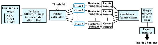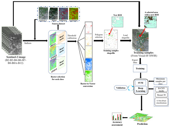 A disadvantage of supervised ML techniques is that they require data for the training models [21]. The manual labeling of such training data can be labor-intensive and prone to inaccuracies, particularly when accurate details are essential. To enhance the accuracy of machine learning, we propose an innovative approach that semi-automates the labeling of the critical training samples using spectral index data and information from the source dataset. Our proposed method allows for the creation of a more effective Regions of Interest (ROIs) for training sample selection from selected spectral index rasters. By improving both the model’s efficiency and its classifier effectiveness, this approach aims to ensure precise and reliable classification outcomes.