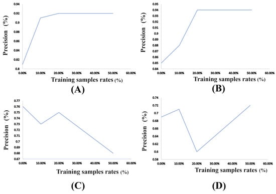 Accuracy assessment of semi-automated indices-based ROI selection for Sentinel-2 and Planet images at varying training sample selection rates: (A) Sentinel-2 with SVM; (B) Planet with SVM; (C) Sentinel-2 with CNN; (D) Planet with CNN.