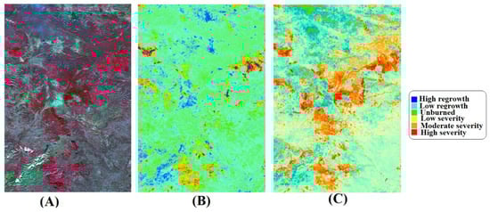The calculated spectral indices for the study area: (A) dNBR; (B) RBR; (C) dBIAS2.