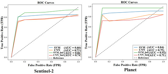 Integrating spectral index results with ground truth data from satellite imagery (Planet and Sentinel-2), pre–post difference, and segmented images alone is inadequate for comprehensive mapping, especially in areas with overlapping classes and canopy cover. To address this, we calibrated thresholds for distinct areas and applied them to ROI for machine learning training. This optimization strategy enhanced model efficiency and performance by incorporating reliable training data, combining spectral indices with source dataset information for labeling. This approach ensures a more effective classification by capturing crucial details that manual labeling might overlook. Our proposed semi-supervised approach utilizing spectral indices for semi-automated labeling displayed promising results, especially evident in the SVM classifier. Notably, our method significantly enhanced accuracies and ROC values for both Sentinel-2 and Planet datasets, showcasing its potential to improve machine learning outcomes (Figure 23).