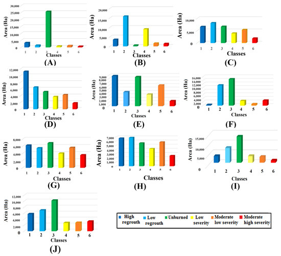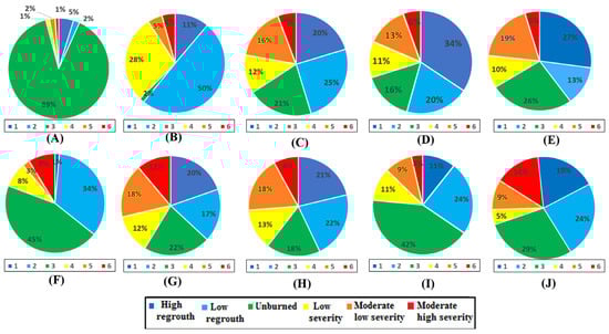 Percentages of all fire severity classes using (A) RBR; (B) dBIAS; (C) Sentinel-2 SVM; (D) Sentinel-2 CNN; (E) Sentinel-2 SA-ROI with SVM; (F) Sentinel-2 SA-ROI with CNN; (G) Planet SVM; (H) Planet CNN; (I) Planet SA-ROI with SVM; (J) Planet SA-ROI with CNN.