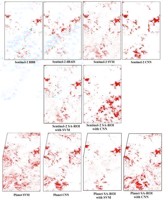 Area: (A) RBR; (B) dBIAS; (C) Sentinel-2 SVM; (D) Sentinel-2 CNN; (E) Sentinel-2 SA-ROI method with SVM; (F) Sentinel-2 SA-ROI with CNN; (G) Planet SVM; (H) Planet CNN; (I) Planet SA-ROI with SVM; (J) Planet SA-ROI with CNN.
