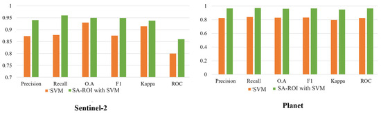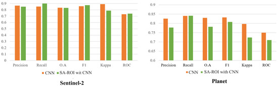 Conversely, a consistency in values arose with Sentinel-2 and Planet images, where both SVM and CNN produce similar rates for all three vegetation classes. These values are depicted in Figure 19C,D,G,H and Figure 20C,D,G,H.