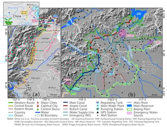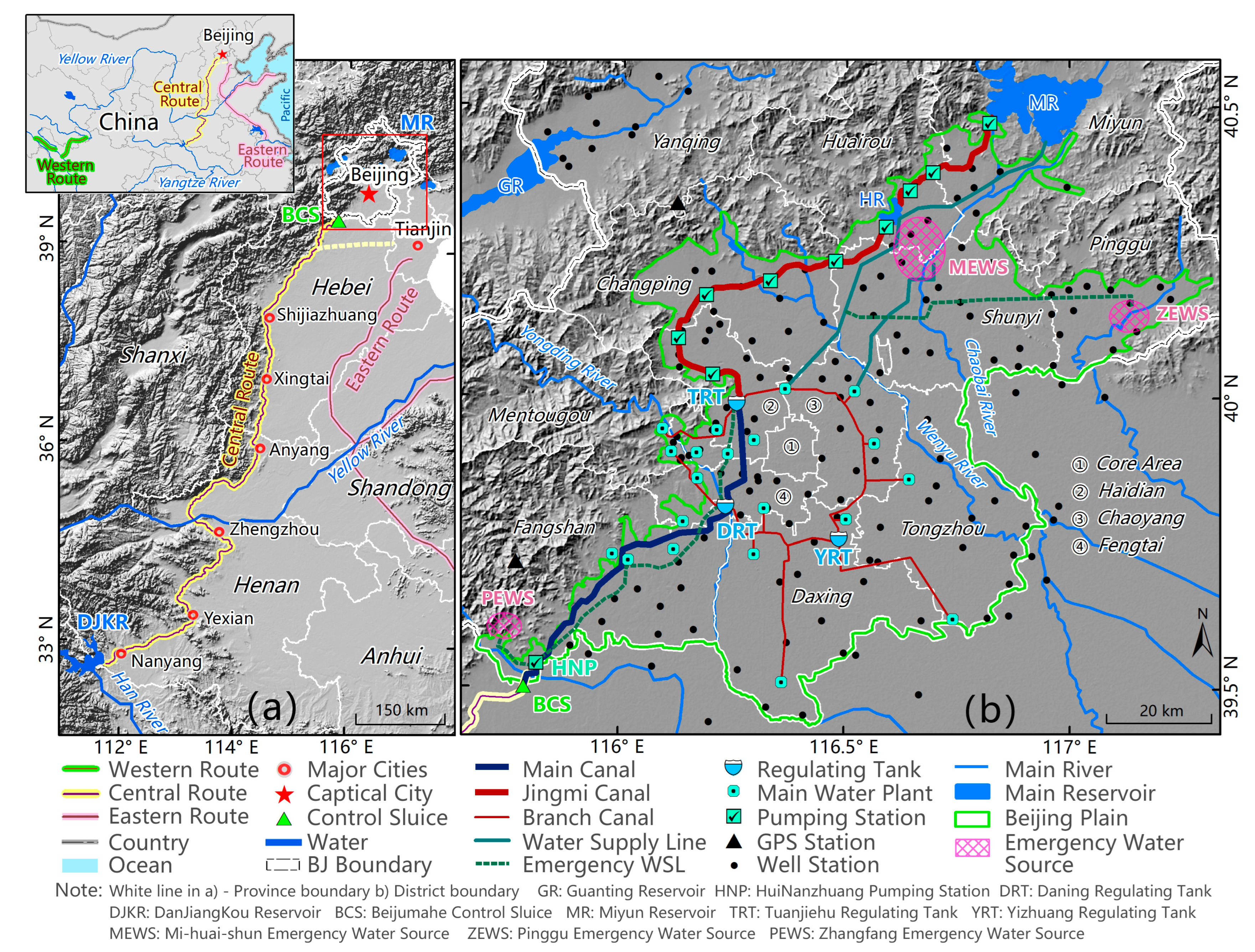 The China South-to-North Water Diversion Project. (a) South-to-North Water Diversion Project Central Route from Danjiangkou Reservoir (DJKR) to Beijing. (b) Beijing South-to-North Water Diversion Project area with supporting infrastructure.