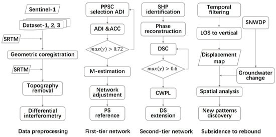 We used the open-source software Generic Mapping Tools Synthetic Aperture Radar (GMTSAR) 6.2 [] to perform the time-series InSAR analyses (Figure 4). The SRTM DEM was employed to remove the terrain phase contribution. After removing the terrain phase contribution, the sum of the interferometric phase can be expressed as follows: