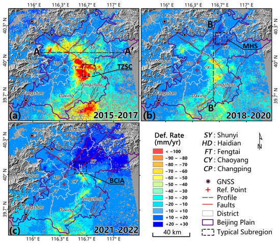 The InSAR-derived results indicate that, overall, the land subsidence pattern in the Beijing Plain changed markedly from 2015 to 2022. First, subsidence diminished abruptly, both in time and space, after 2015. Second, the northeast region rose after 2015. Third, the spatial heterogeneity of surface movements is evident across the whole region. The central district (the reference point location) and west side of BJP remained stable (−10 to 10 mm/yr) from 2015 to 2022. The areas with the highest rates of subsidence (>100 mm/yr from 2015 to 2017; red color region in Figure 5a) experienced a marked change in 2018. The subsidence rates in this area decreased to <80 mm/yr, and the rebound phenomenon happened in the Miyun–Huairou–Shunyi region for the first time on record of BJP deformation (Figure 5b). By 2021, this region almost ceased to subside, and uplift at a rate of more than 30 mm/yr happened in the northern part of BJP from 2021 to 2022 (Figure 5c). Details and analyses of two typical profiles, AA′ in an east–west direction, BB′ in a north–south direction, and three typical sub-regions (TZSC, MHS, and BCIA) are discussed in the following sections.