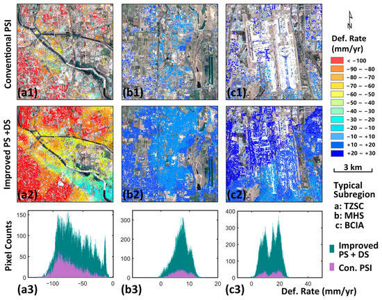 Statistical and spatial distributions of pixels in the typical sub-region a, b, and c (Figure 5) by conventional PSI and improved PS and DS methods. The conventional PSI deformation results at the boundary of Tongzhou subsidence bowl (TZSB) (a1), Mi-Huai-Shun recharge region (MHS) (b1), and Capital International Airport (BCIA) (c1); the improved PS and DS deformation results at the boundary of TZSB (a2), MHS (b2), and BCIA (c2). Pixel counts difference between conventional PSI and improved methods results in TZSC (a3), MHS (b3), and BCIA (c3).