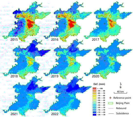 Cumulative subsidence of the Beijing Plain is manifested in three subsidence regions: northwest, central-east, and central-south. However, this subsidence does not reflect the specific temporal evolution process. In reality, the most severely subsided area, the center of the subsidence zone at the point indicated in Figure 11g, has experienced almost no subsidence since 2020. The subsidence rate at the point indicated in Figure 11f has decreased yearly from 2015 to 2020. In summary, the years from 2015 to 2020 mark a period of minor subsidence in Beijing.