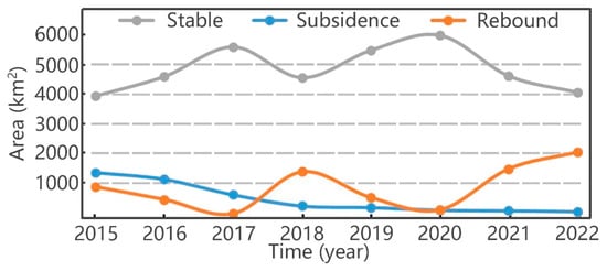 We assumed that an annual deformation rate of −30 mm sets the boundaries of subsidence areas []. There are no existing standards for defining uplift phenomena, but considering that uplift was observed on a large scale in Beijing for the first time, we defined regions with annual deformation greater than +10 mm as uplift areas []. We calculated statistics for subsidence and uplift for different years based on these assumptions to document the patterns of deformation from 2015 to 2022. In summary, subsidence in the Beijing Plain area gradually diminished over time, the variability in uplift increased, and the size of stable regions initially grew and then decreased.