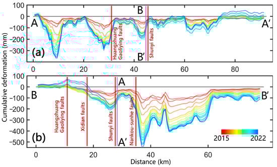 Time-series deformation changes along typical profiles AA′ and BB′ from 2015 to 2022. (a) Profile AA′ and (b) Profile BB′. (Locations of typical AA′ and BB′ are shown in Figure 5a,b, respectively).