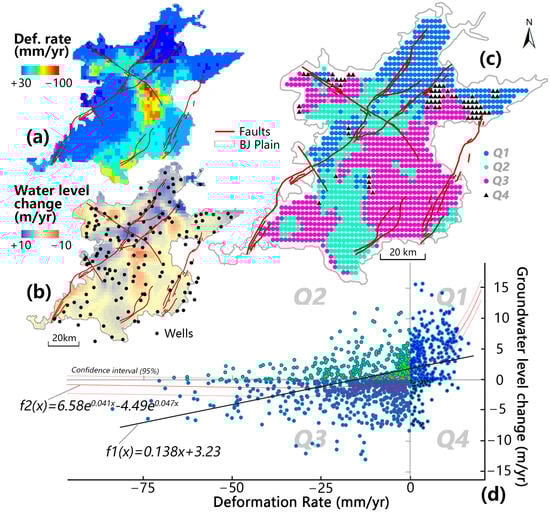 Spatial relationship between surface deformation and changes in groundwater levels on the Beijing Plain. (a) Deformation rate map from 2015 to 2022. (b) Rate of groundwater level change from 2015 to 2022. (c) Spatial distribution of four (Q1 to Q4) patterns between groundwater level changes and deformation rates. (d) Plot and best fits between groundwater level changes and deformation rate.