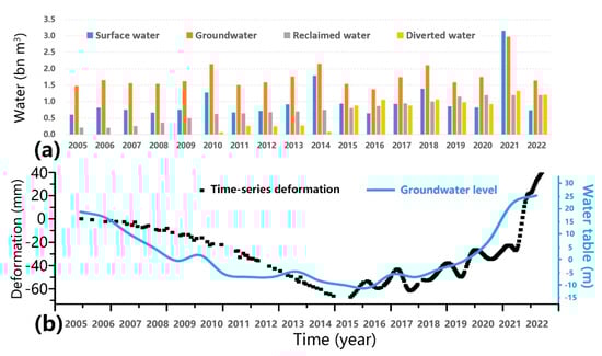 Groundwater level change and surface deformation turning point in the Mihuaishun recharge area from 2005 to 2022. (a) Water resource change from 2005 to 2022 in Beijing. (b) Time-series deformation and groundwater level change from 2005 to 2022 at typical point in recharge area. Time-series deformation from 2005 to 2014 derived from ASAR and RadarSAT-2 acquisitions using the PSI method [].