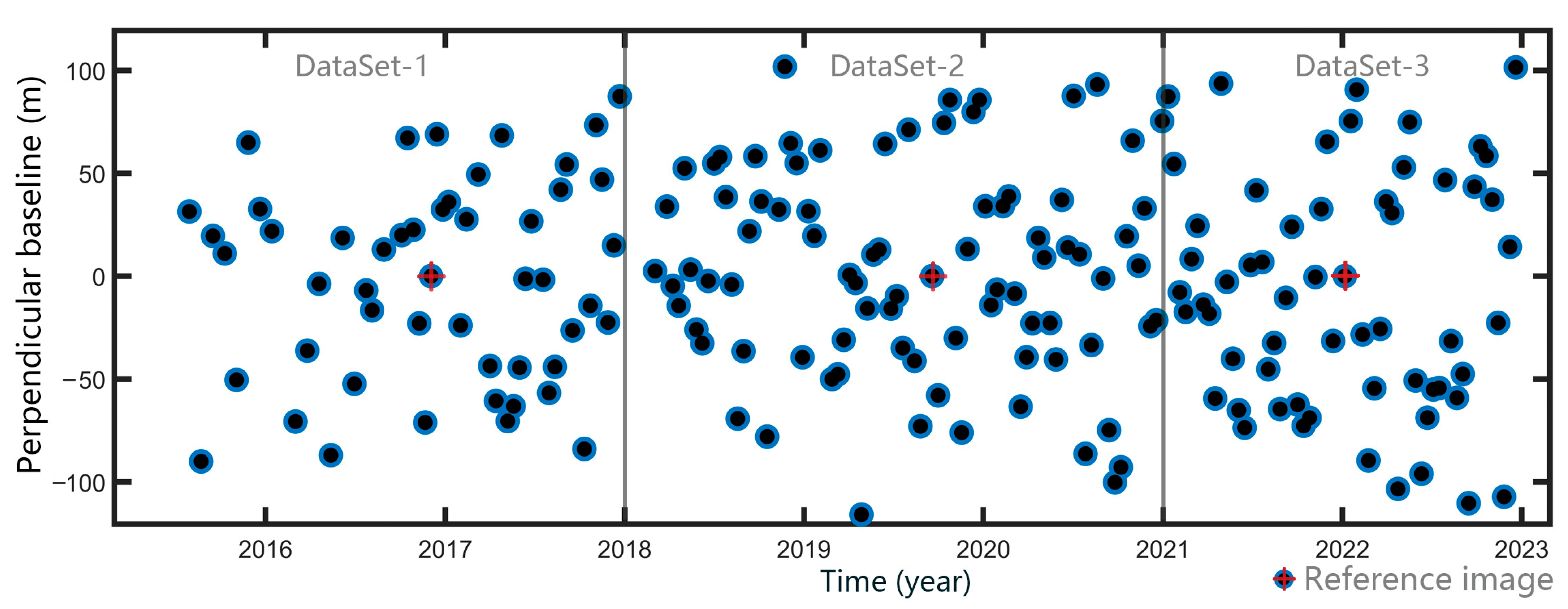 Temporal and perpendicular baselines of interferograms. The blue points are SAR images, and the red cross points are the reference images in each dataset. Every image is paired with the reference image in each dataset to prepare interferograms.