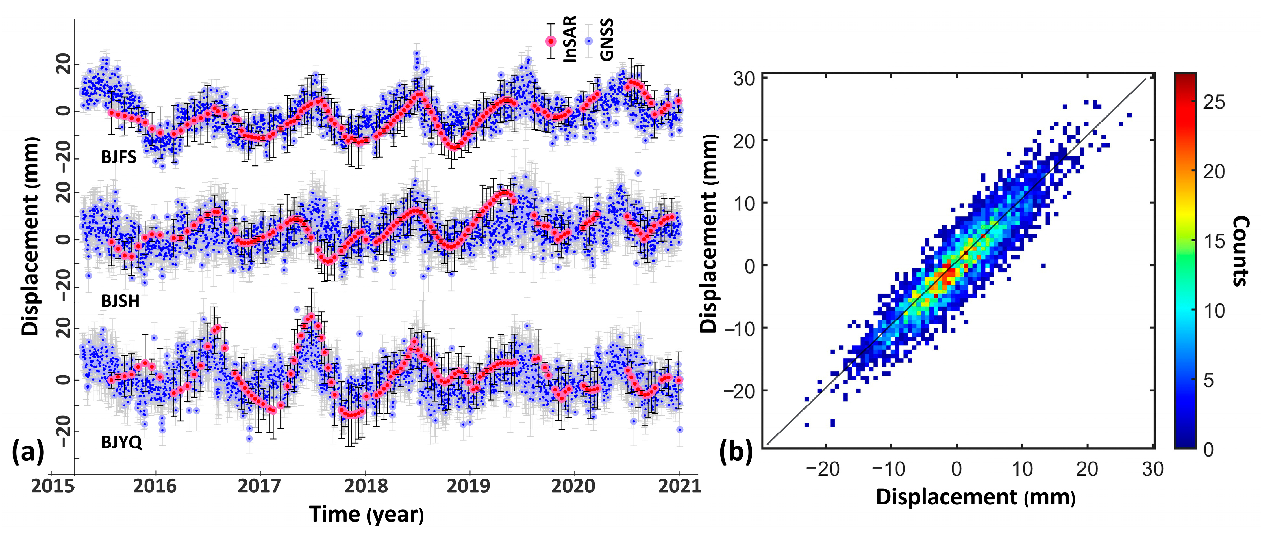 Validation of InSAR-derived results with ground GNSS measurements. (a) Time series of GNSS stations BJFS, BJSH, and BJYQ (locations shown in Figure 5) and InSAR-derived displacement, with 1-sigma confidence intervals (black vertical bars). (b) Cumulative displacement comparisons between InSAR and the three GNSS stations. The different colors show the count density in different displacement ranges.
